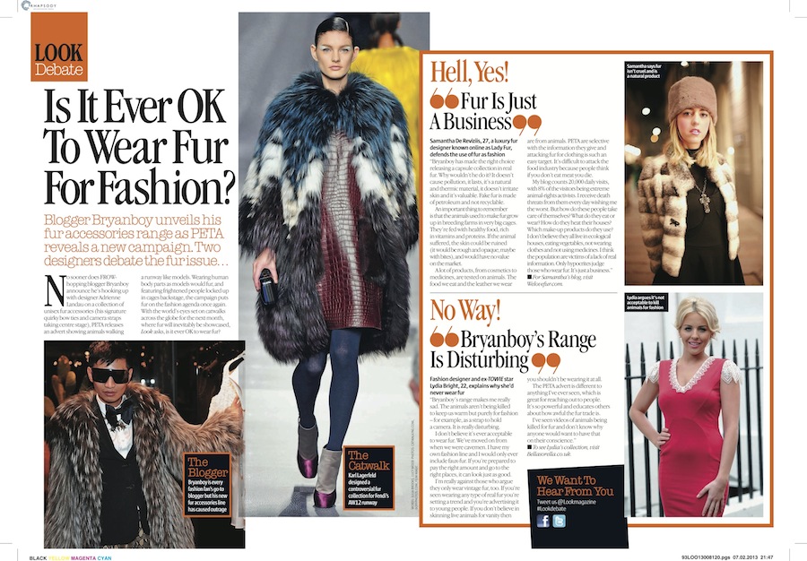 Pochi giorni fa sono stata intervistata da Look Magazine UK.  Mi hanno chiesto un parere riguardo alla collezione di BryanBoy in pelliccia e il tema pellicce durante la settimana della moda.