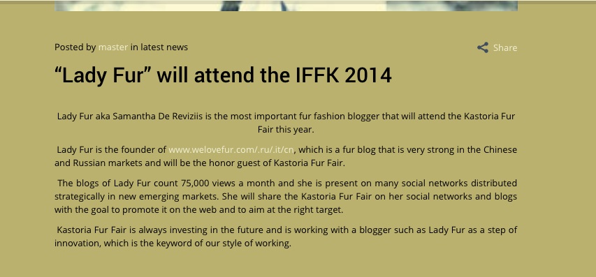 Condividerò in real time tutte le news inerenti la fiera e la mia esperienza. http://furfairkastoria.com/lady-fur-will-attend-the-iffk-2014/#