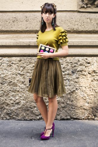 Maglia e gonna verde : Moschino Cheap&Chic Borsa : Moschino Cheap&Chic Orecchie in vera pelliccia : Lady Fur Scarpe : John Galliano Orecchini :…